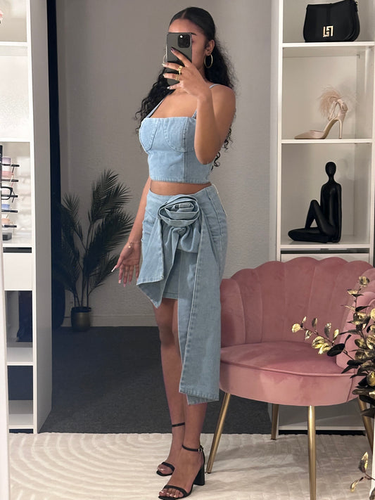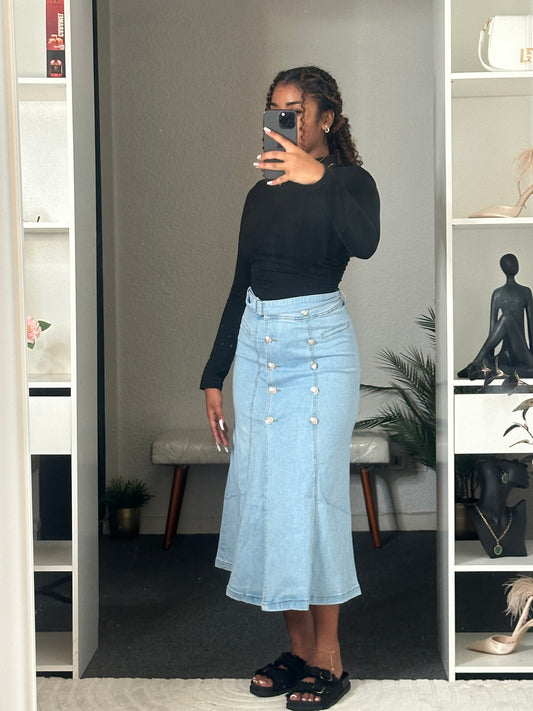 Jupe Denim Clair – Coupe Évasée & Boutons Bijou